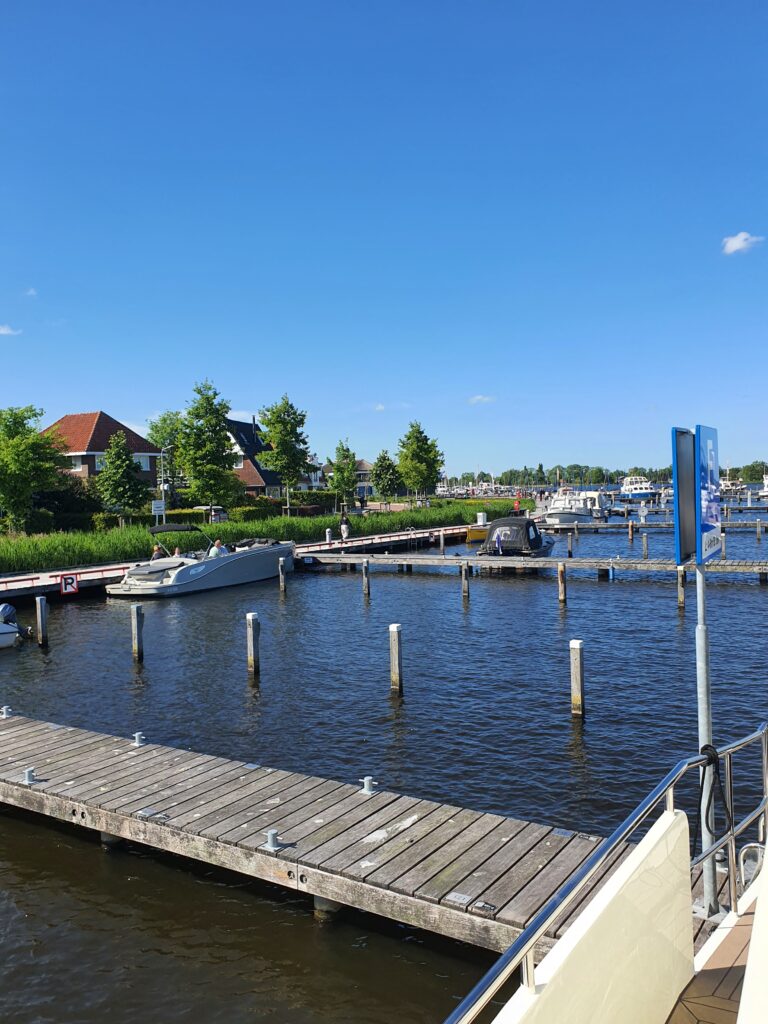 We waren eerst naar de kade in het centrum gevaren, maar de ruimte aan de kade is beperkt en zelfs in het voorseizoen was er geen plek. Daarom teruggevaren naar de Pikmeerhaven en dat was geen slechte keus. De Pikmeer haven is een grote overzichtelijke ruim opgezette haven gelegen aan een klein strand. Voldoende ruimte om met de hond te lopen in de nabije omgeving.